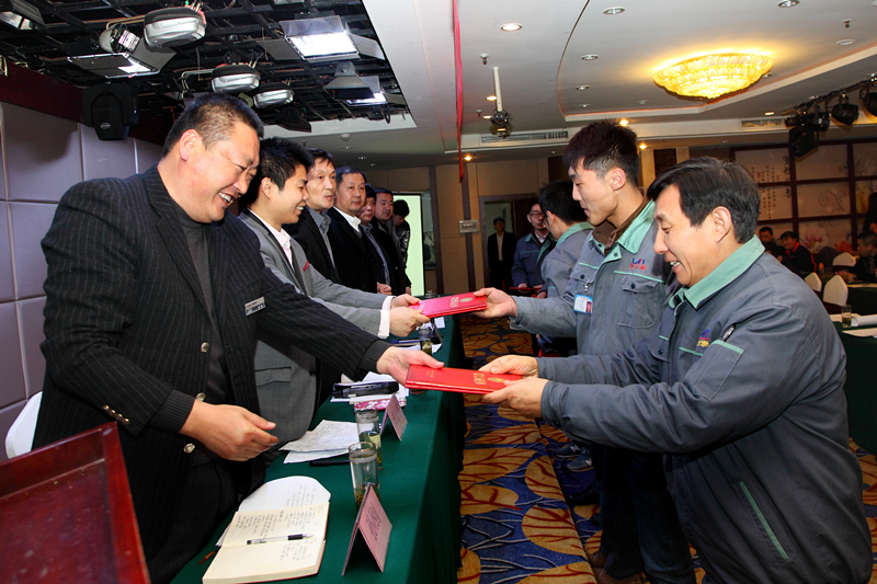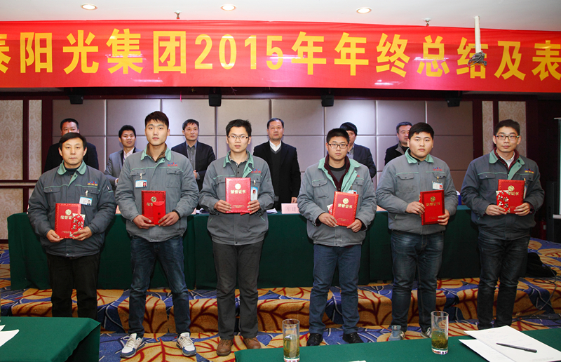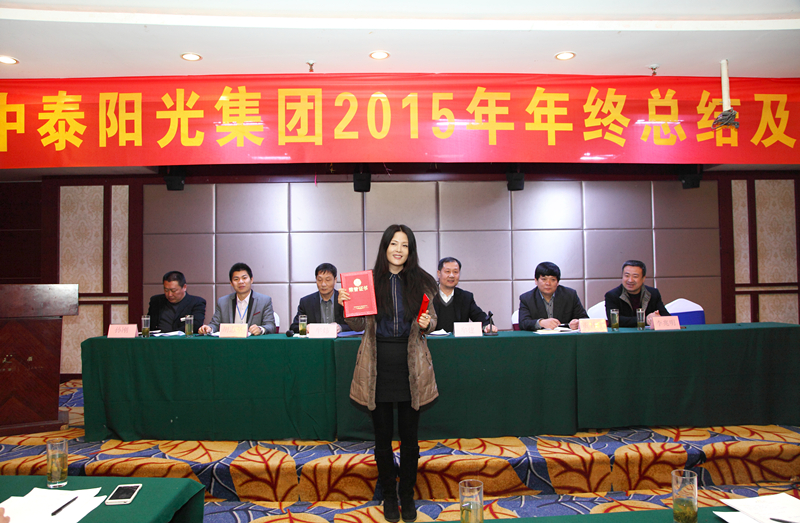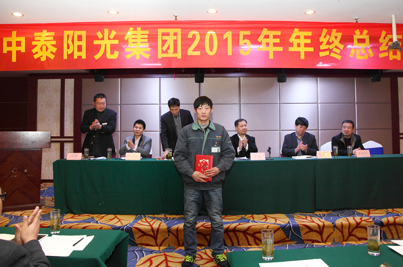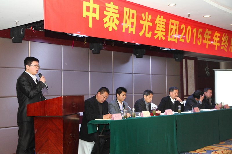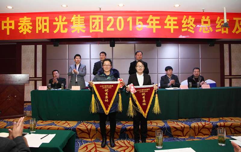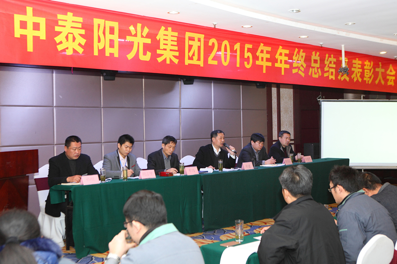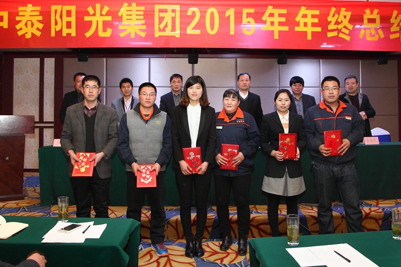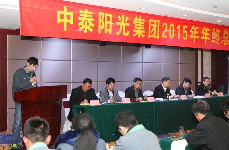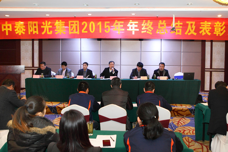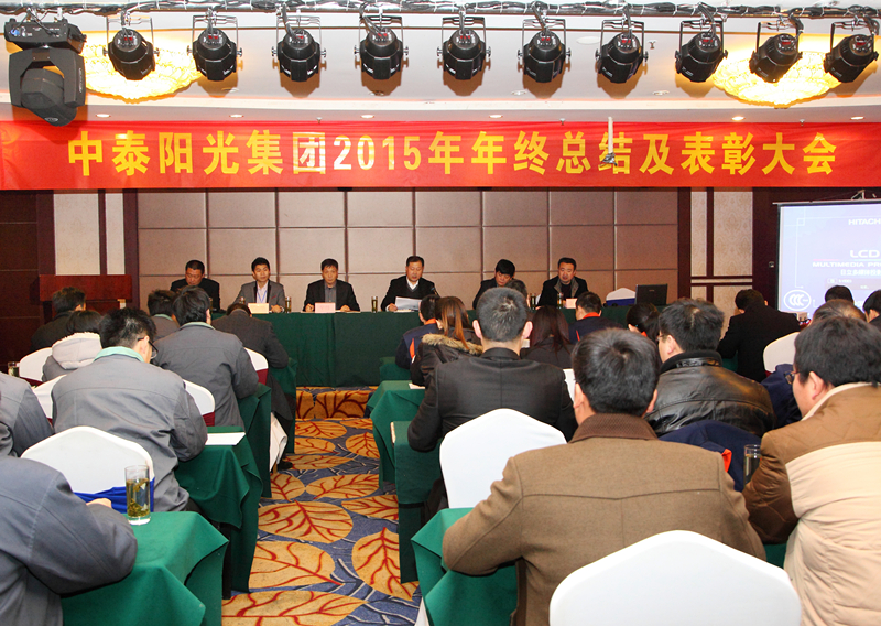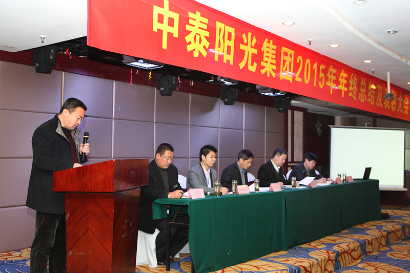 2016年1月30日,山東中泰陽光集團在日照君臨天下大酒店,舉行2015年年終工作總結及表彰大會,公司領導及中泰陽光集團全體后勤人員,銷售部、生產部班組長以上及受表彰人員參加會議。會議由牟建董事長主持并宣布會議開始,會議安排如下:集團公司財務總監(jiān)向大會作《2015年公司財務分析報告》;公司副總經理胡志堅向大會作《2015年技術工作總結報告》;公司黨支部書記、常務副總經理牟煒向大會作《2015年工作總結報告》;職工代發(fā)言;由黨支部書記、常務副總經理牟煒宣讀獲得:“優(yōu)秀班組獎”、“優(yōu)秀創(chuàng)新獎”、“優(yōu)秀員工獎“優(yōu)秀新人獎”“銷售冠軍獎”人員名單,并由公司高層為獲獎者頒發(fā)證書和獎金;最后,由集團董事長致辭,董事長根據全球經濟形勢,就2015年集團發(fā)展狀況及2016年集團發(fā)展規(guī)劃作總結性發(fā)言。