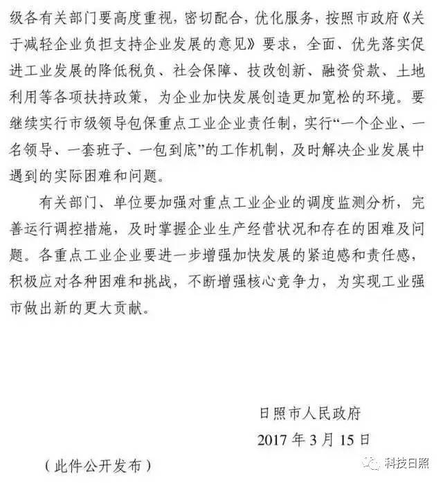 文件高度肯定了重點培植工業企業對日照市經濟、社會發展的重要意義,并要求“各級各有關部門要高度重視,密切配合,優化服務,按照市政府《關于減輕企業負擔支持企業發展的意見》要求,全面、優先落實促進工業發展的降低稅負、社會保障、技改創新、融資貸款、土地利用等各項扶持政策,為企業加快發展創造更加寬松的環境”,同時文件強調,“要繼續實行市級領導包保重點工業企業責任制,實行“一個企業、一名領導、一套班子、一包到底”的工作機制,及時解決企業發展中遇到的實際困難和問題”。