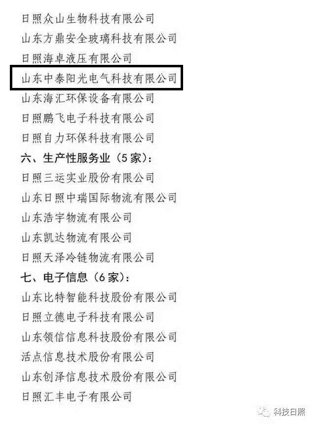 3月15日,日照市政府公布了日照市重點培植的百家工業企業名單,山東中泰陽光電氣科技有限公司入選日照市創新企業。